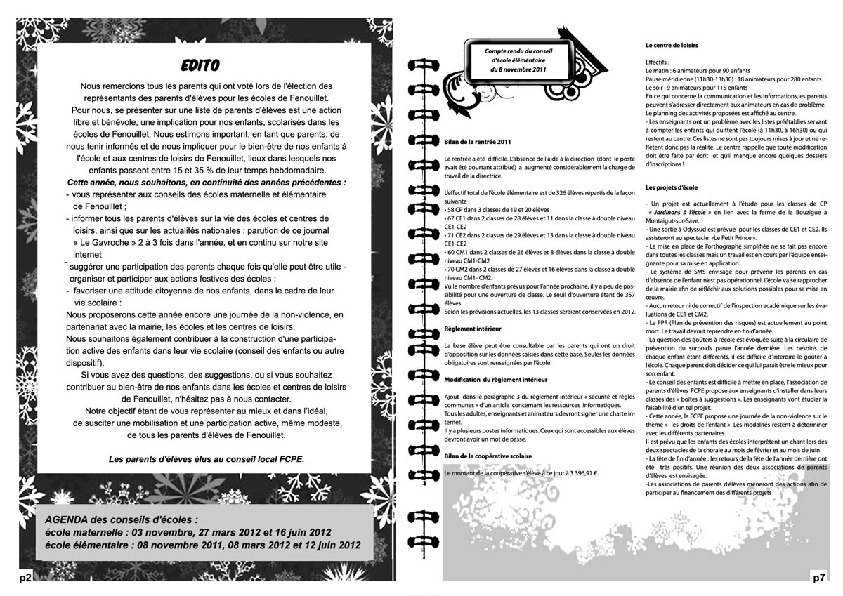 Ce journal vise à informer les parents des comptes-rendus des conseils d'école et de ce qui se passe dan les écoles maternelle et élémentaire de Fenouillet.